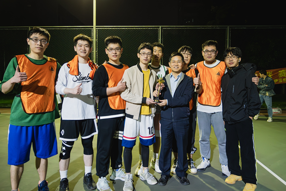 11月7日晚迎来了本届赛事的重头戏——冠军争夺赛。开场联培队率先发难,经过一个高质量的挡拆之后由11号球员稳稳命中上篮,但职工队气势上丝毫不输,通过不断冲击内线频频造成联培队的犯规,死死咬住分数,一时间场上比分你追我赶,不相上下。面对这样的焦灼局面,联培队外线射手站了出来,借助队友的掩护在外线频繁三分球出手得分,逐渐帮队伍建立两位数的领先优势。上半场结束职工队17比28落后。在短暂的中场休息后,职工级展开了反扑,冲击内线打成二加一并命中罚球,后续的连续精妙配合进攻甚至直接将比分重新缩小至个位数。但奈何联培队的外线球员手感火热,内线球员篮板拼抢凶猛,内外精妙配合频繁投进三分球、中投,让比分一直保持着领先,最终联培队以47比41摘得冠军头衔。11号球员丁国平则以24分5篮板,投中6记三分球的完美数当之无愧的获得了“总决赛MVP”称号。