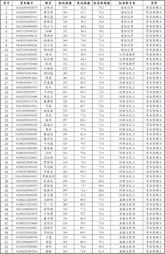 2022年杭高院化学与材料科学学院硕士统考生拟录取名单公示